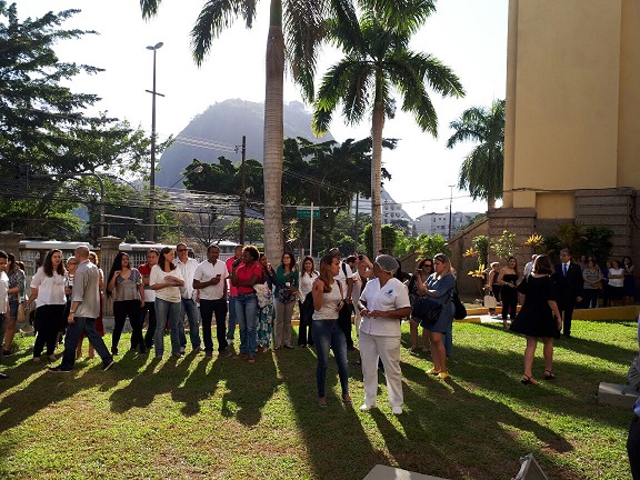 Alunos, pais e servidores assistindo à cerimônia, realizada no gramado em frente à fachada do IBC.